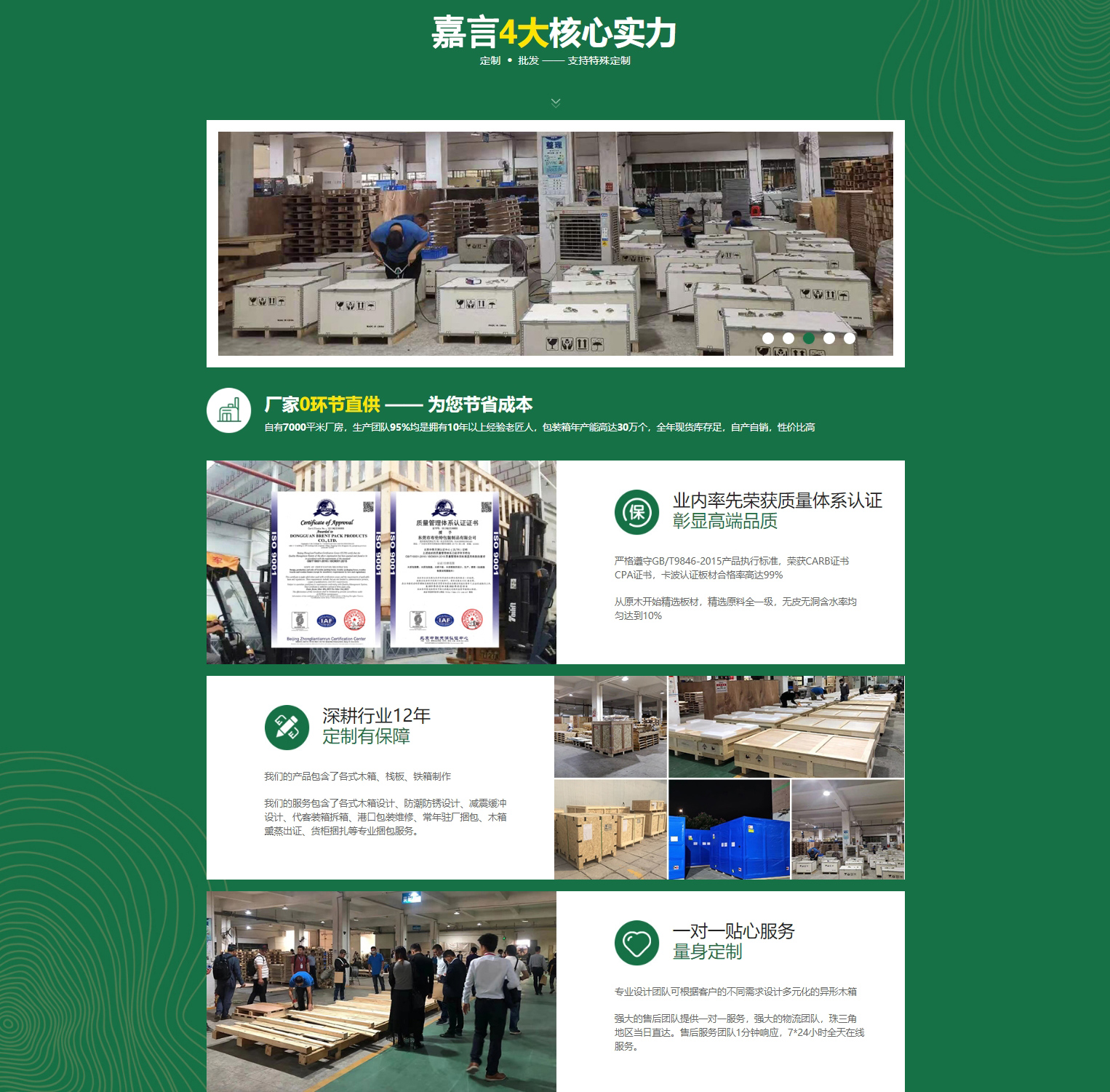佛山市嘉言包裝制品有限公司起源于2012年,是一家集產品設計、生產加工、包裝報檢于一體,專業從事包裝木箱、托盤、航空箱的生產,并提供專業、精細化的重型機械打包、精密儀器打包服務的企業。
